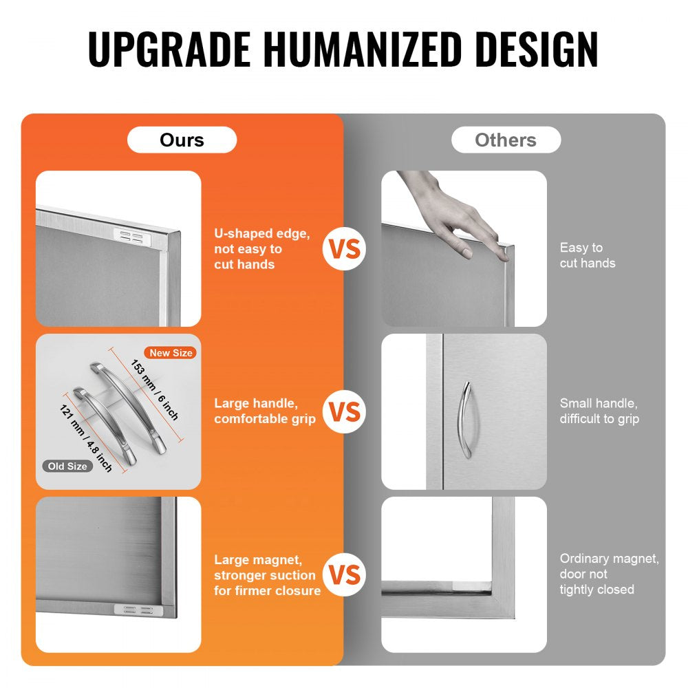 • Gebruiksvriendelijk ontwerp: fijne ergonomische handgrepen van zinklegering, vergroot formaat voor eenvoudig openen. De randen van het deurkozijn zijn gebogen en verdikt voor een veiliger gebruik en een gebruiksvriendelijkere ervaring, zodat je zorgeloos kunt genieten van koken in je buitenkeuken.