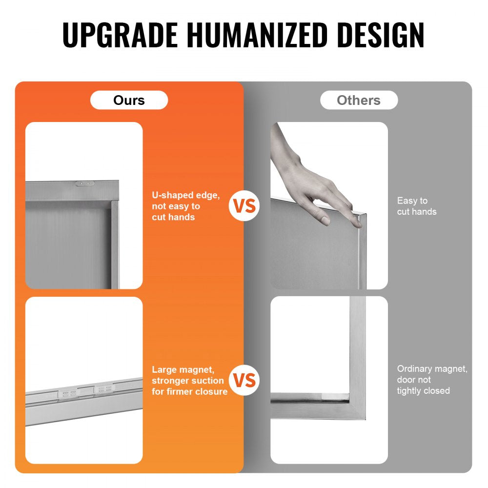 Deze grilltoegangsdeur is gemaakt van een stevige, hoogwaardige roestvrijstalen constructie, is roestvrij, waterdicht, krasbestendig en gemakkelijk schoon te maken zonder sporen of vlekken achter te laten. Naadloos ontwerp zonder scherpe randen zorgt voor gebruikersveiligheid.