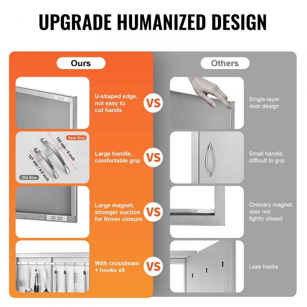 Deze grilltoegangsdeur is gemaakt van een stevige, hoogwaardige roestvrijstalen constructie, is roestvrij, waterdicht, krasbestendig en gemakkelijk schoon te maken zonder sporen of vlekken achter te laten. Volledig naadloos ontwerp, geen scherpe hoeken, zorgt voor gebruikersveiligheid.