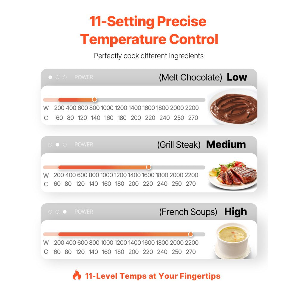 Met een vermogen van 2200 W warmt deze draagbare inductiekookplaat sneller op dan traditionele gasfornuizen, waardoor koken sneller en gemakkelijker wordt. De vermogensniveaus kunnen worden aangepast voor het bereiden van soepen, bonen, sauzen, pasta en nog veel meer.