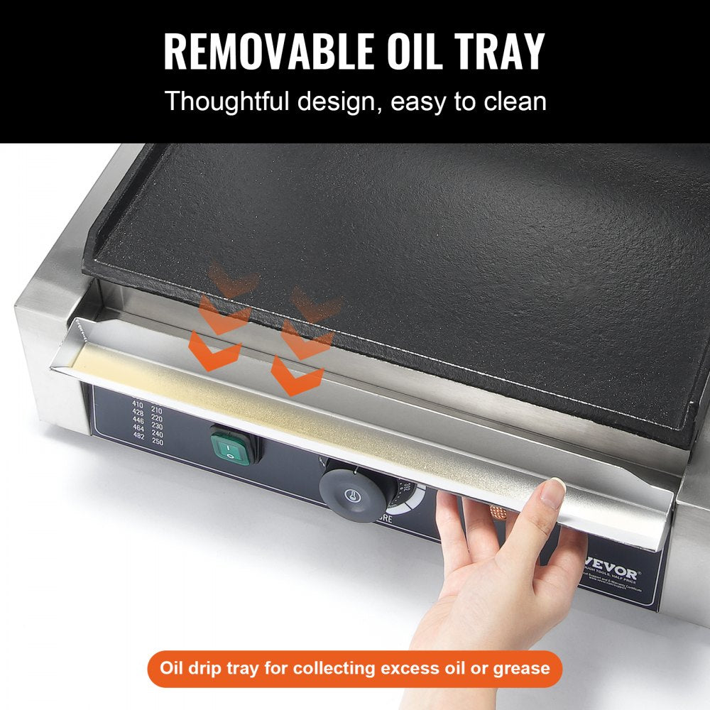 Het roestvrijstalen elektrische tosti-ijzer is uitgerust met een uitneembare lekbak die vet, olie of andere resten die van de kookplaat druipen opvangt, waardoor het schoonmaken eenvoudiger wordt.