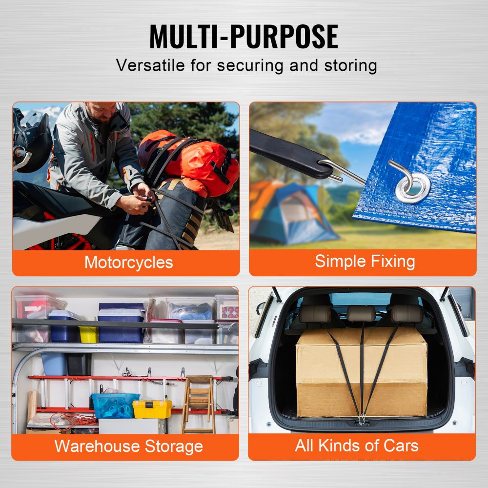 Met hun ultralange elastische bungeeriemen zijn ze perfect voor het opbergen van spullen in verschillende vormen en maten. Ze zijn essentieel voor gemakkelijke opslag en veilig transport.