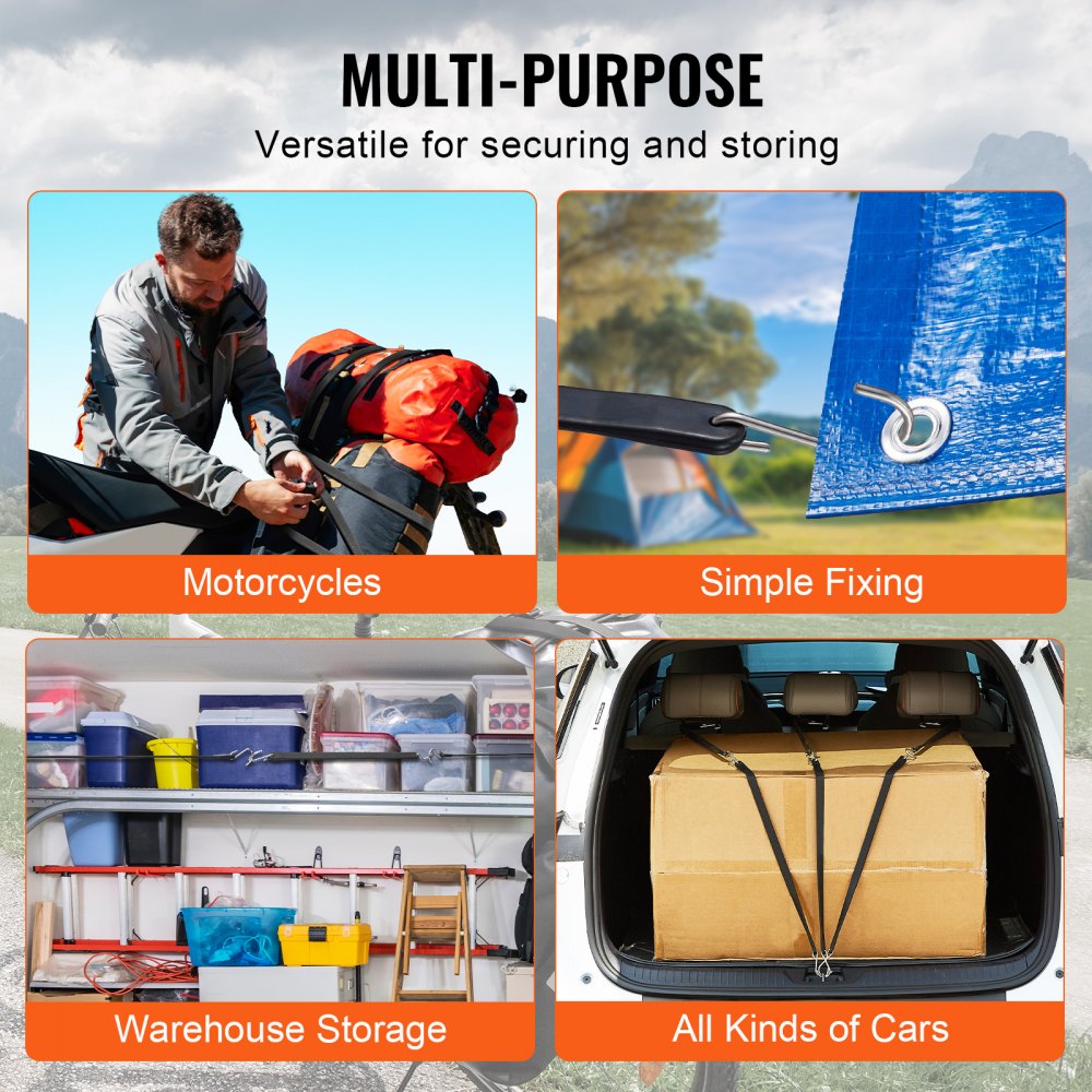 • Veelzijdigheid: deze bungeeriemen zijn geschikt voor thuisorganisatie, buitenavonturen of logistiek. Ze kunnen met gemak elke taak aan en voldoen aan talloze behoeften voor het beveiligen of opbergen van spullen.