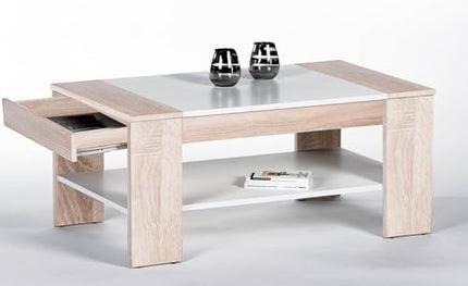 Einzelheiten: Der Couchtisch FINLEY/FINLEY PLUS ist eine lichte Gestalt, die sich in Ihrem Wohnzimmer perfekt macht. Er wirkt modern, ohne bemüht trendy sein zu wollen und macht sich auch noch richtig nützlich. Sonoma Eiche und Beton Dekor trifft hier auf Weiß. In punkto Nützlichkeit hat dieser Tisch Ihnen aber auch noch einiges zu bieten. Sie können oben drauf alles ablegen, was Sie gerne schnell zur Hand haben. Eine Etage tiefer und in der Schublade befindet sich dann der Rest, der ein bisschen aus den Augen geraten soll. Mit diesem Tisch haben Sie einen smarten Mittelpunkt, der Ihren Feierabend verschönt. Sie können diesen Tisch ganz leicht selbst zusammensetzen. So wächst er Ihnen auch noch schneller ans Herz. Der Couchtisch FINLEY/FINLEY PLUS macht sich im Wohnzimmer nützlich und gibt dabei auch noch eine richtig gute Figur ab.