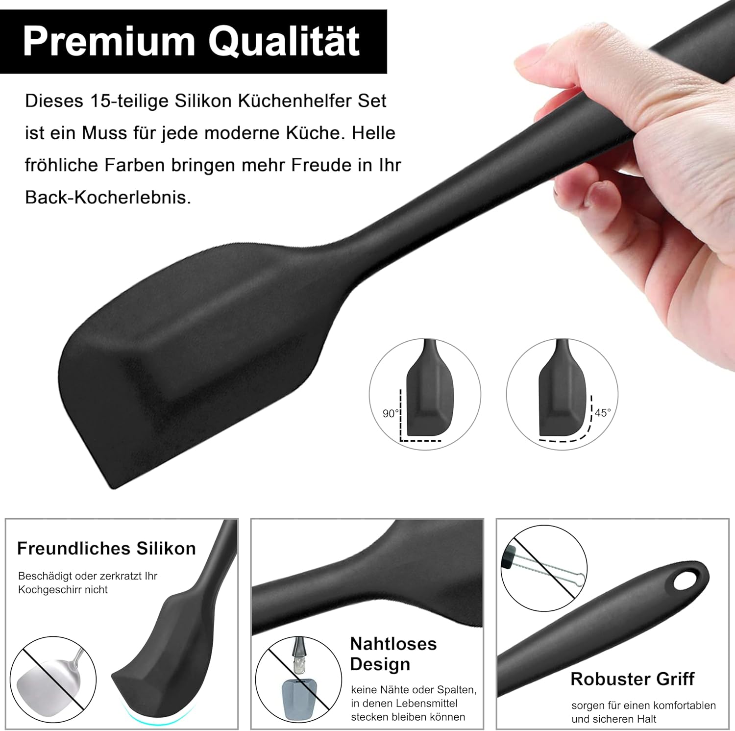 Professioneel design: deze kookgereiset heeft een naadloos ontwerp uit één stuk, er zijn geen openingen meer voor het inklemmen van levensmiddelen en bij het roeren van kleurrijke levensmiddelen zoals tomatenproducten ontstaat geen vreemde geur of restkleur. De zachte siliconen kop bekrast je antiaanbakpan niet. De robuuste siliconen handgreep heeft een ergonomisch ontwerp dat aangenaam vast te houden is en ook warmteoverdracht bij het koken en warme handen kan voorkomen