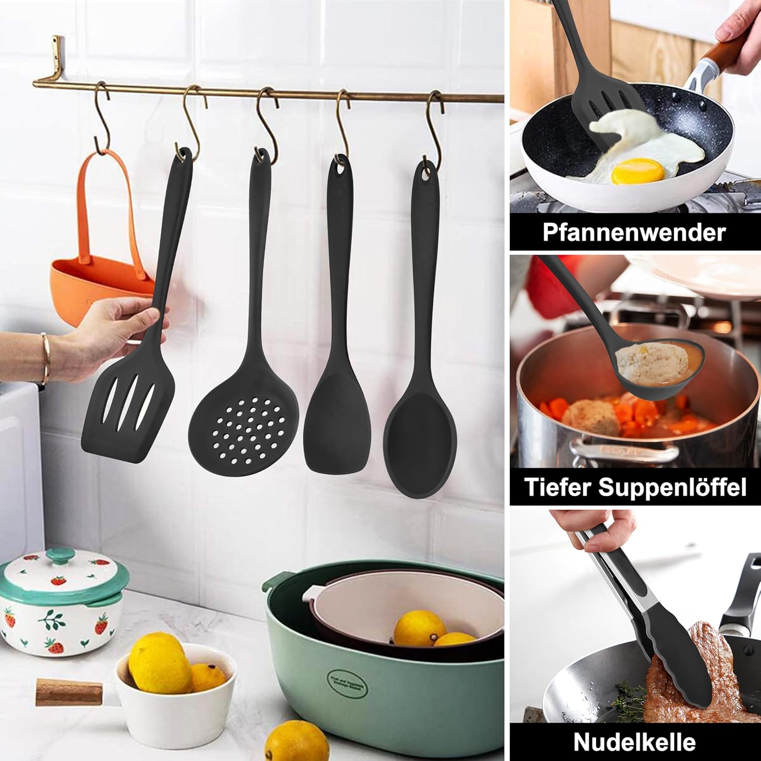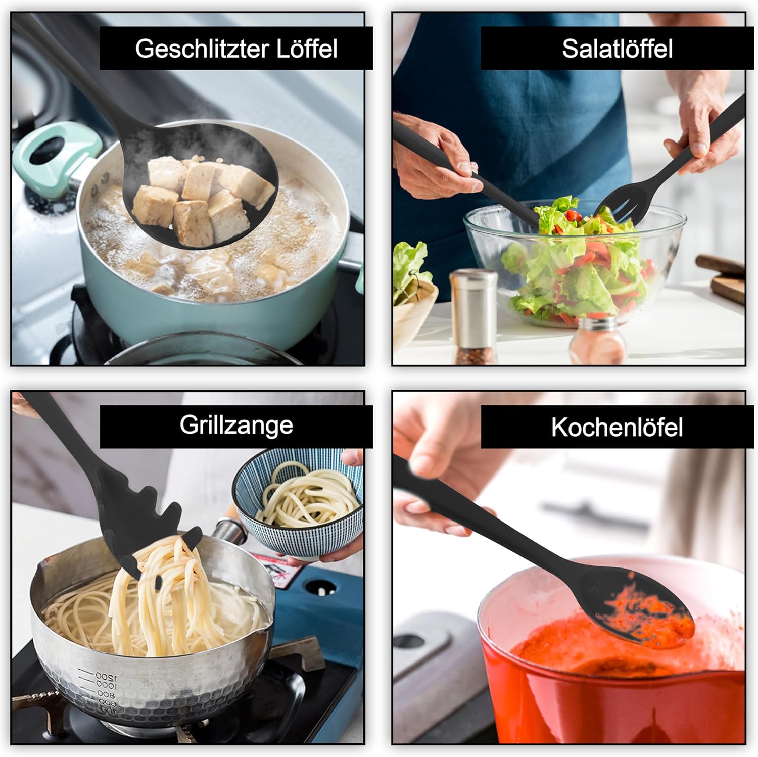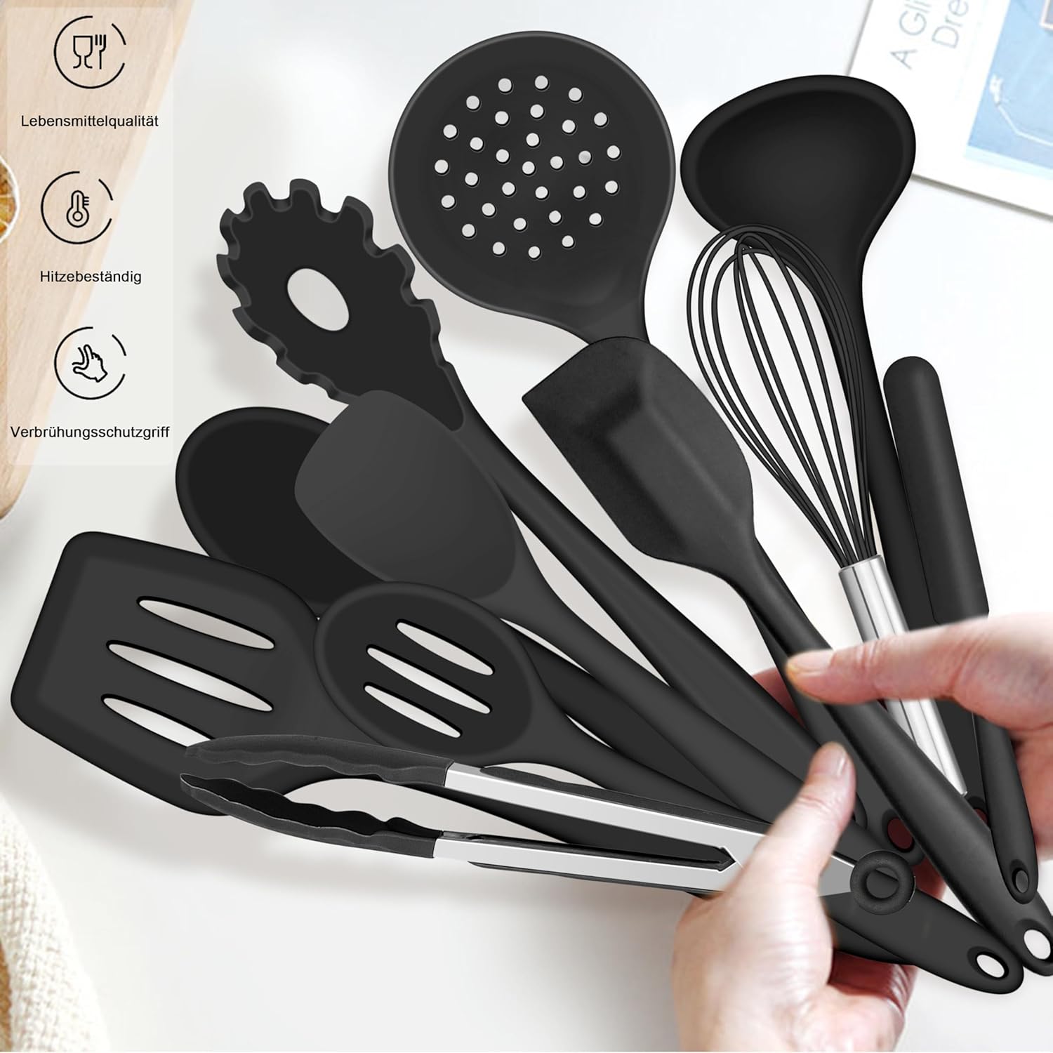Veilige en milieuvriendelijke materialen: de Joyfair keukenhulpset bestaat uit voedselveilige siliconen, dat veilig op elk type levensmiddelen kan worden gebruikt, zonder je zorgen te hoeven maken dat bij het koken smelten of gevaarlijke stoffen ontstaan. Het is niet giftig, geurloos, corrosiebestendig, sterk en duurzaam, niet zo gemakkelijk te kraken en te vormen als houten kookgerei. Hittebestendigheid tot 230 °C