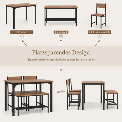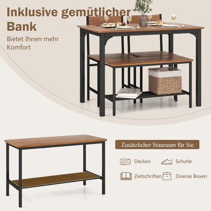 Einzelheiten: Produktbeschreibung: Die Sitzgruppe besteht aus einem Esstisch, zwei Essstühlen und einer Sitzbank mit Netzablage und ist sowohl funktional als auch stilvoll. Diese Sitzgarnitur ist aus robustem MDF gefertigt, um Langlebigkeit zu gewährleisten. Die Metallbeine sorgen für zusätzliche Stabilität und Halt. Außerdem ist das Sitz-Set mit rutschfesten Füßen ausgestattet, um Ihren Boden zu schützen. Außerdem verfügt die Bank über ein praktisches Netzregal, das viel Platz für die Aufbewahrung Ihrer Sachen bietet. Das kompakte Design der Sitzgruppe hilft, Platz für kleinere Räume zu sparen. Und das Beste daran ist, dass diese Sitzgarnitur mit ihrer industriellen Ästhetik einen modernen Touch in Ihr Zuhause bringt. Eigenschaft: Perfekte Sitzgarnitur für bis zu 4 Personen Platzsparendes Design für kleine Räume Geräumige Tischplatte und Regal für reichlich Stauraum Robuste Materialien sorgen für eine lange Nutzungsdauer Verstärkung von dreieckigem Metall für strukturelle Stabilität Mit Rückenlehne für eine ergonomische Sitzposition Anti-Rutsch-Fußmatten zur Vermeidung von Kratzern auf dem Boden Glatte Oberfläche für schnelle Reinigung Produktinformationen: Farbe: Rustikales Braun/ Braun/ Grau Material: Metall, MDF Tischgröße: 110 x 70 x 76 cm (L x B x H) Stuhlgröße: 43 x 40 x 86 cm (L x B x H) Bankgröße: 85 x 36 x 46 cm (L x B x H) Belastbarkeit des Tisches: 90 kg Belastbarkeit des Stuhls: 150 kg Belastbarkeit der Bank: 300 kg Nettogewicht: 30 kg Paket beinhaltet: 1 x Esstisch 2 x Esszimmerstuhl 1 x Sitzbank 1 x Anleitung