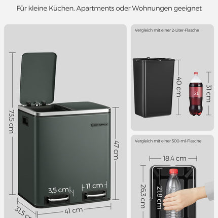 - [Perfekt für kleine Küchen] Dieser kompakte Mülleimer mit zwei 15-Liter-Fächern passt perfekt in kleine Küchen, Wohnungen oder kleine Häuser, damit Sie Ihren Müll, z. B. Verpackungsmüll und Bioabfall, spielend einfach sortieren