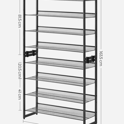• Stabiliteit staat voorop: elke plank kan 4 paar herenschoenen of 5 paar damesschoenen (tot 10 kg) dragen en blijft ook bij volledige belasting stabiel. Voor extra veiligheid wordt een kantelbeveiliging meegeleverd, die je moet gebruiken als je de schoenenorganizer op elkaar stapelt