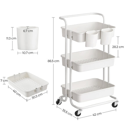 SONGMICS Trolley, 3 niveaus, serveerwagen, keukenwagen met handvat, 2 kleine hangcompartimenten, 2 remmen, kunststof opbergvakken, eenvoudig te monteren, slaapkamer, wasruimte, wit BSC067W01