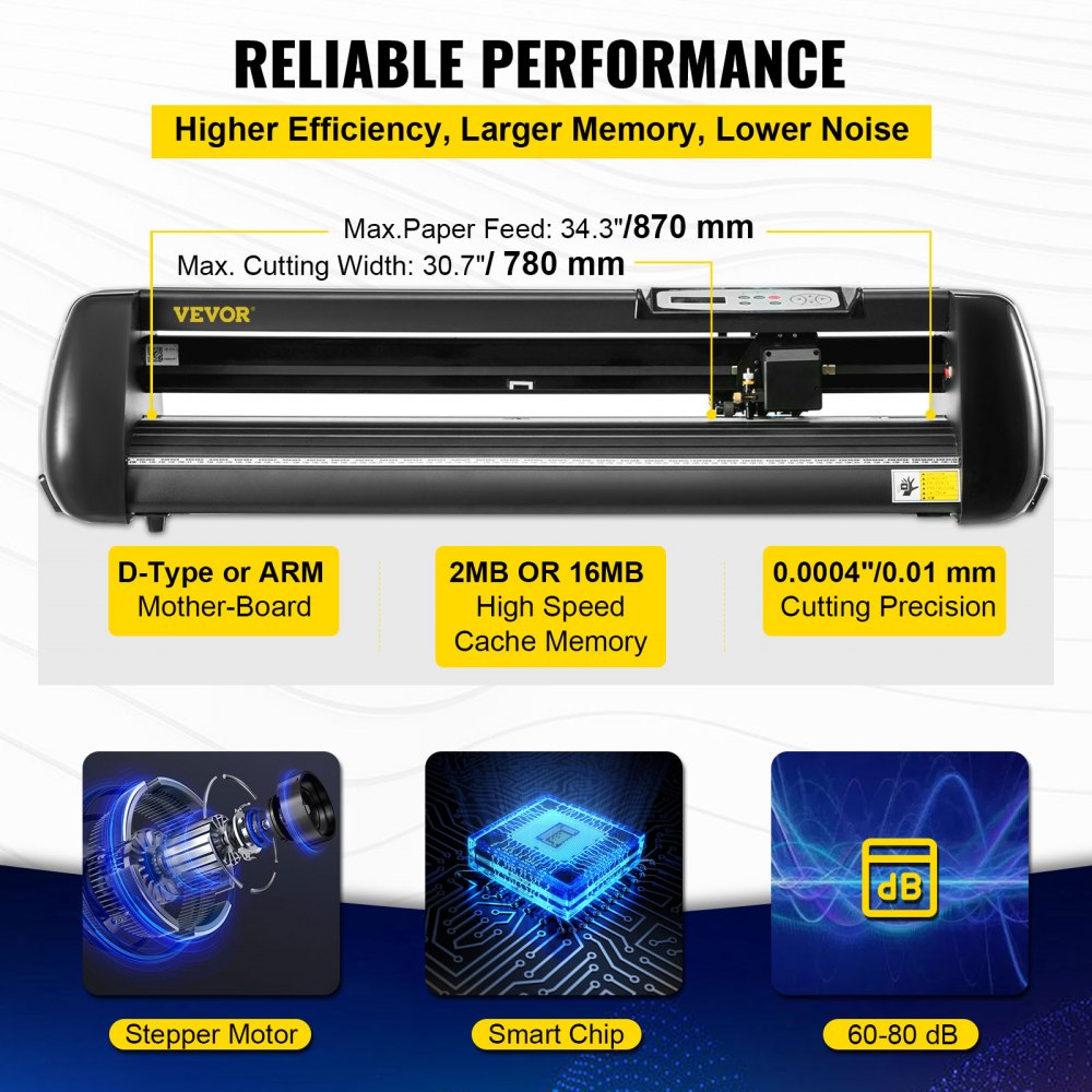 Deze professionele 34-inch vinylsnijder met standaard wordt geleverd met een eenvoudig te gebruiken ontwerp en SIGNMASTER-software waarmee u professionele, op maat gemaakte ontwerpen en borden kunt snijden. U heeft de mogelijkheid om uw lettertypen te gebruiken, aangepaste afbeeldingen te importeren en uw vormen te tekenen! Onze vinylsnijder heeft een stevige constructie met een duurzame stappenmotor die zorgt voor hoge snelheid en een laag geluidsniveau. Maximale papierinvoer: 34 inch/780 mm; Maximale maaibreedte: 30,7 inch/780 mm.