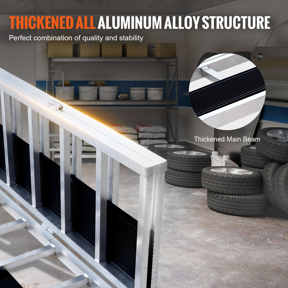 De oprit kan worden ingeklapt voor eenvoudige opslag en transport. De aluminiumlegering en het geperforeerde ontwerp zorgen voor een laag gewicht. Eén persoon kan de oprit gemakkelijk hanteren en opzetten.