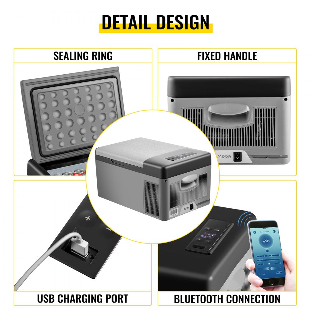 Met de afdichtring is de koelkast goed afgesloten zonder dat er koude lucht lekt. Deze koelkast is makkelijk mee te nemen door de handvatten aan de zijkant van de koelkast vast te houden. De USB-oplaadpoort biedt een gemakkelijke manier om uw telefoon op te laden. Je kunt de koelkast op afstand bedienen met je telefoon, wat heel eenvoudig en handig is.