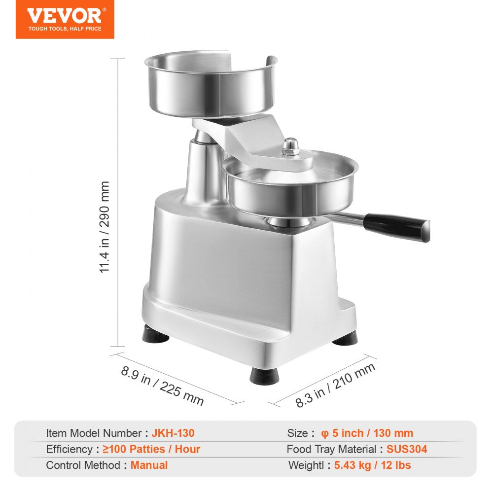 De commerciële hamburgerpers verhoogt de efficiëntie in de keuken omdat hij meer dan 100 pasteitjes per uur kan persen. De roestvrijstalen behuizingen en de behuizing van aluminiumlegering maken de machine roestbestendig, gemakkelijk schoon te maken en duurzaam.