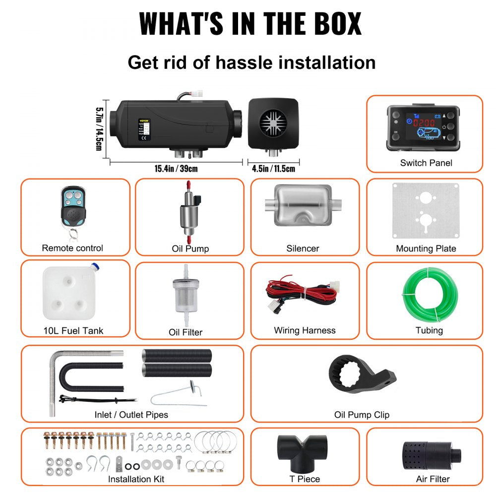 Afmetingen VEVOR 5 kW dieselkachel: 15,4 inch x 5,7 inch x 4,5 inch.