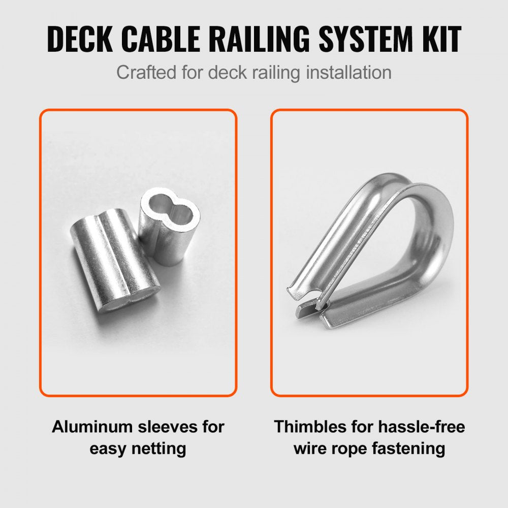VEVOR staalkabelset: aluminium mouwen voor snel trekken van het net en kousen voor eenvoudige kabelbevestiging.