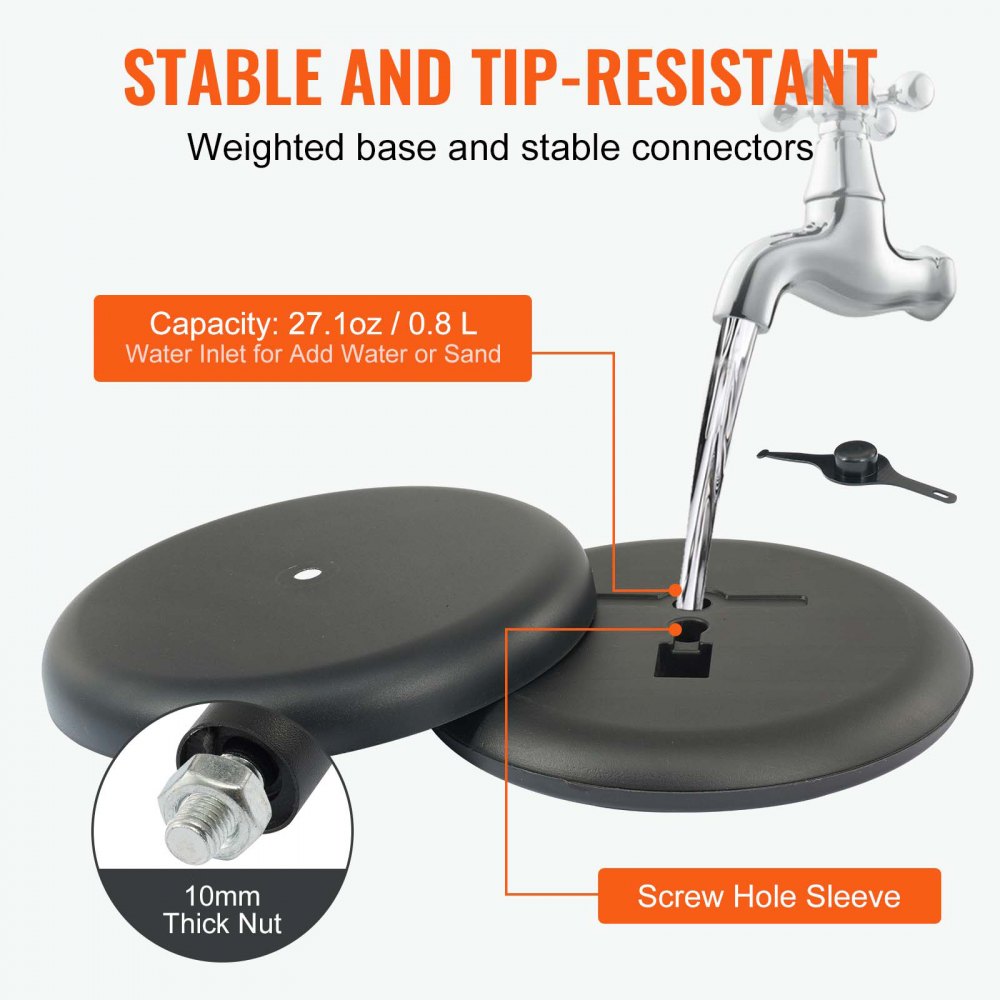 De basis kan worden geopend om te worden gevuld met zand of water, wat extra stabiliteit en weerstand biedt tegen schokken en lichte buitenwind. De verdikte moer van de steunstang zorgt voor een stabiele verbinding tussen de steunstang en de basis.