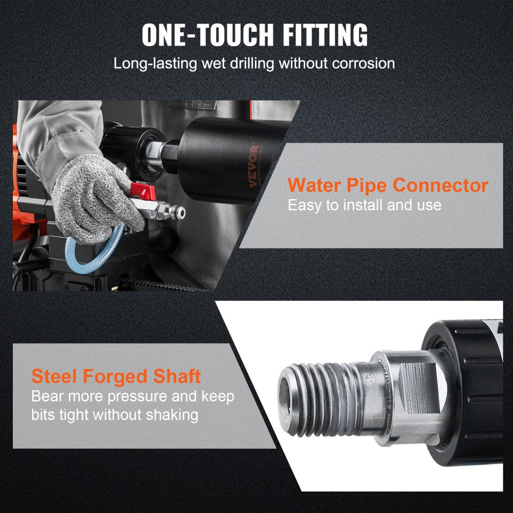 Omdat de machine boven het hoofd werkt, zou er onvermijdelijk water op de boor lopen. In dit geval heeft onze boorstelling een gesmede, roestvrije uitgaande as en een snelkoppeling voor de waterleiding om een permanente watertoevoer te garanderen.
