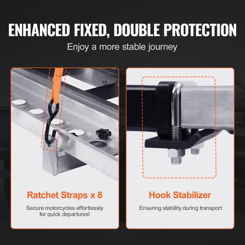 • Laadvermogen van 600 pond: ons aluminium trekhaakrek voor motorfietsen met een laadvermogen van 600 pond kan gemakkelijk twee motorfietsen dragen en biedt een stabiele ondersteuning voor motorfietsen van alle maten, van lichtgewicht tot zwaargewicht, tijdens transport.