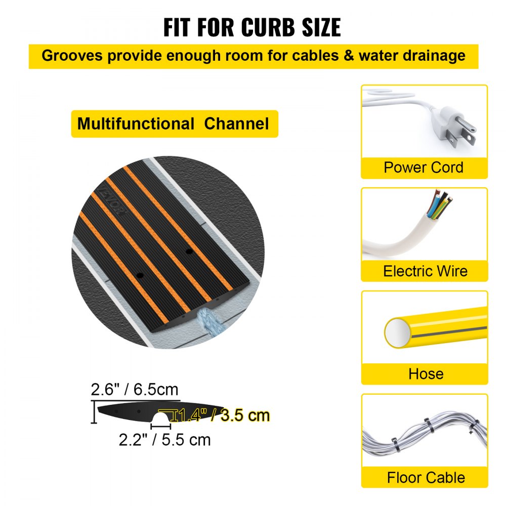 Deze snelheidshelling is ontworpen om de verkeerssnelheid te regelen en voldoende ruimte te bieden voor wegkabels zonder schade aan auto's of wegen te veroorzaken. Het heeft een hoogwaardige rubberen constructie, met reflecterende gele delen, een laadvermogen van 22.046 lbs en is veilig bij gebruik 's nachts.