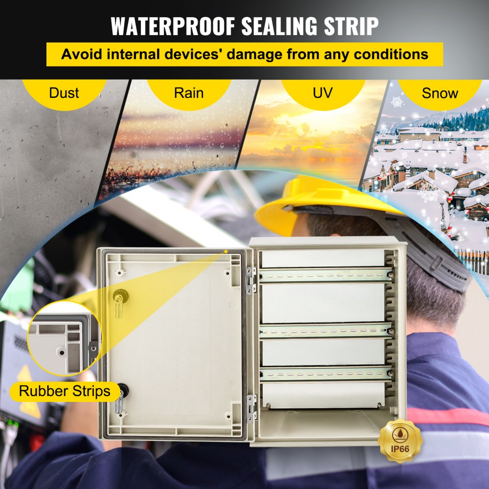 De schakelkast is zorgvuldig gemaakt van robuust, glasvezelversterkt polyester. Nauwkeurig slotontwerp, zeer sterke scharnieren, afdichtstrips en IP66-bescherming zijn ontworpen om uw plug-ins, netsnoeren en andere apparaten in ruwe omgevingen te beveiligen. Het wordt veel gebruikt voor binnen- en buitentoepassingen, zoals elektriciteit, bouw, hotel en andere industrieën. Een robuuste, goed gemaakte bedieningskast biedt optimale bescherming en zorgt het hele jaar door voor consistente prestaties. Kies een naam die u kunt vertrouwen: VEVOR.