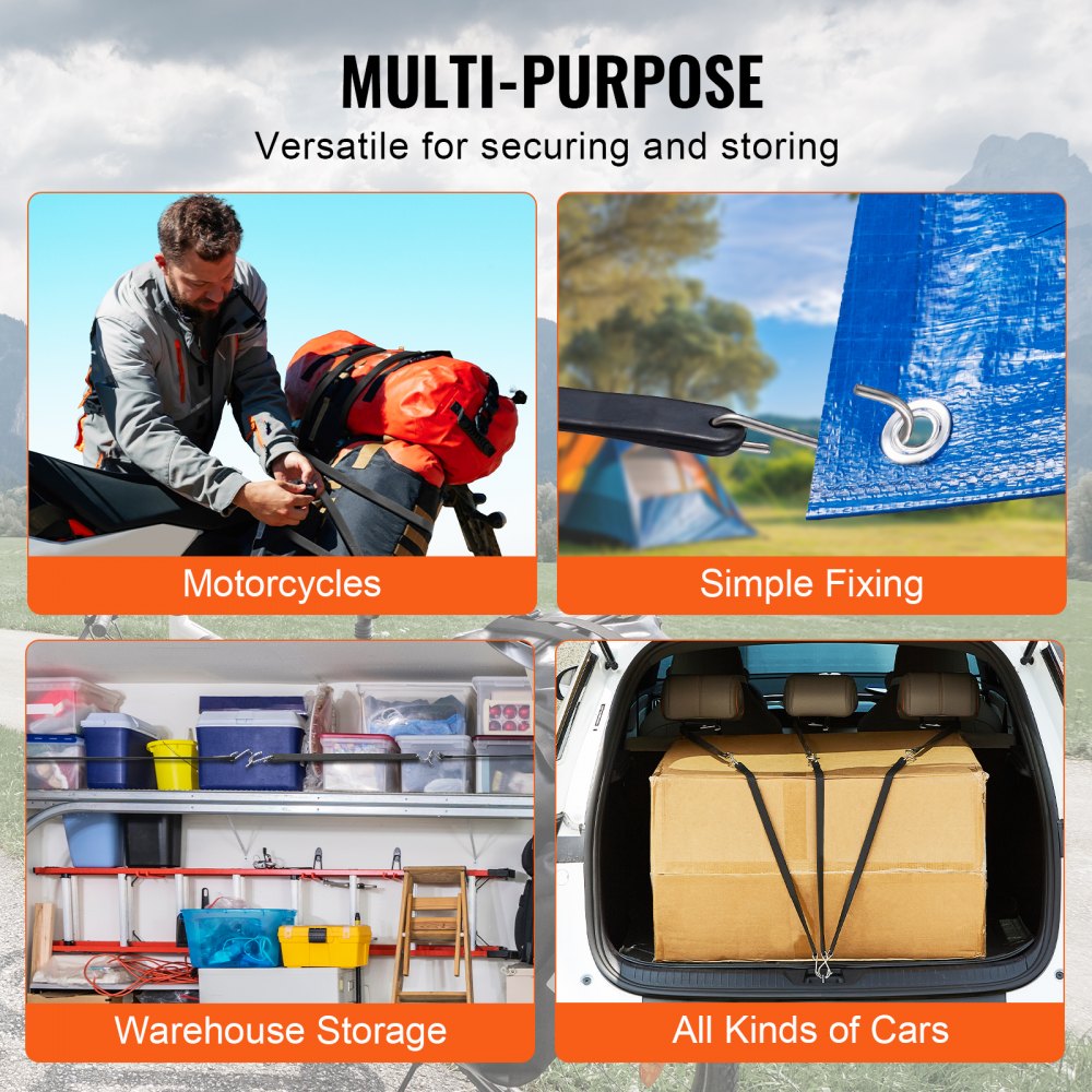 Met hun ultralange elastische bungeeriemen zijn ze perfect voor het opbergen van spullen in verschillende vormen en maten. Ze zijn essentieel voor gemakkelijke opslag en veilig transport.