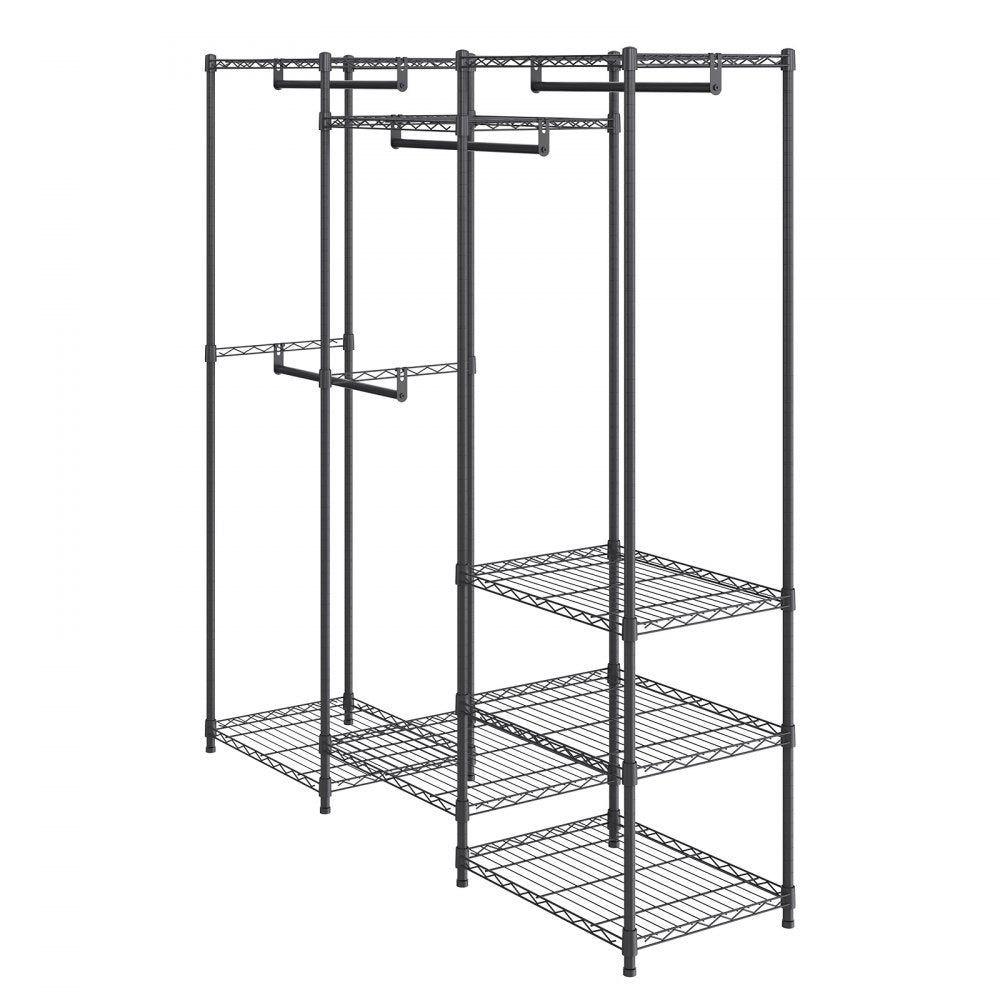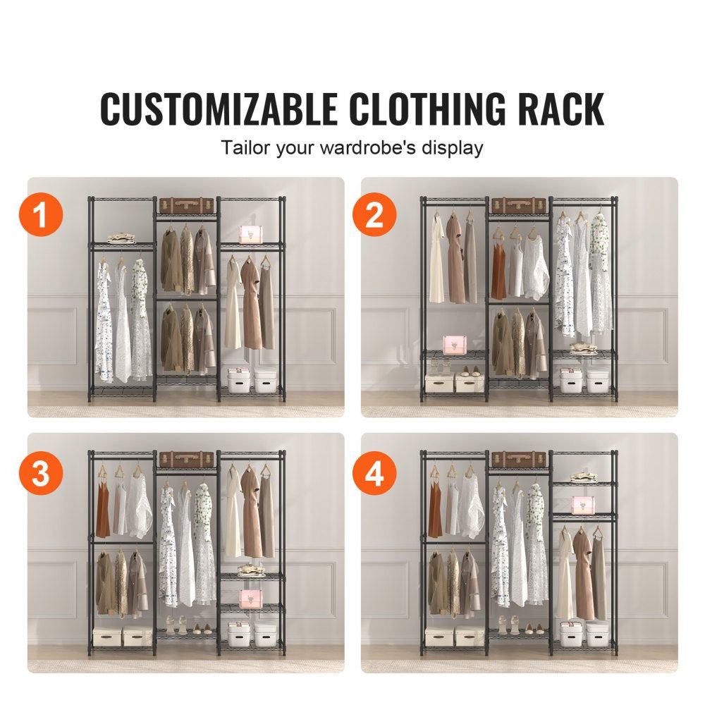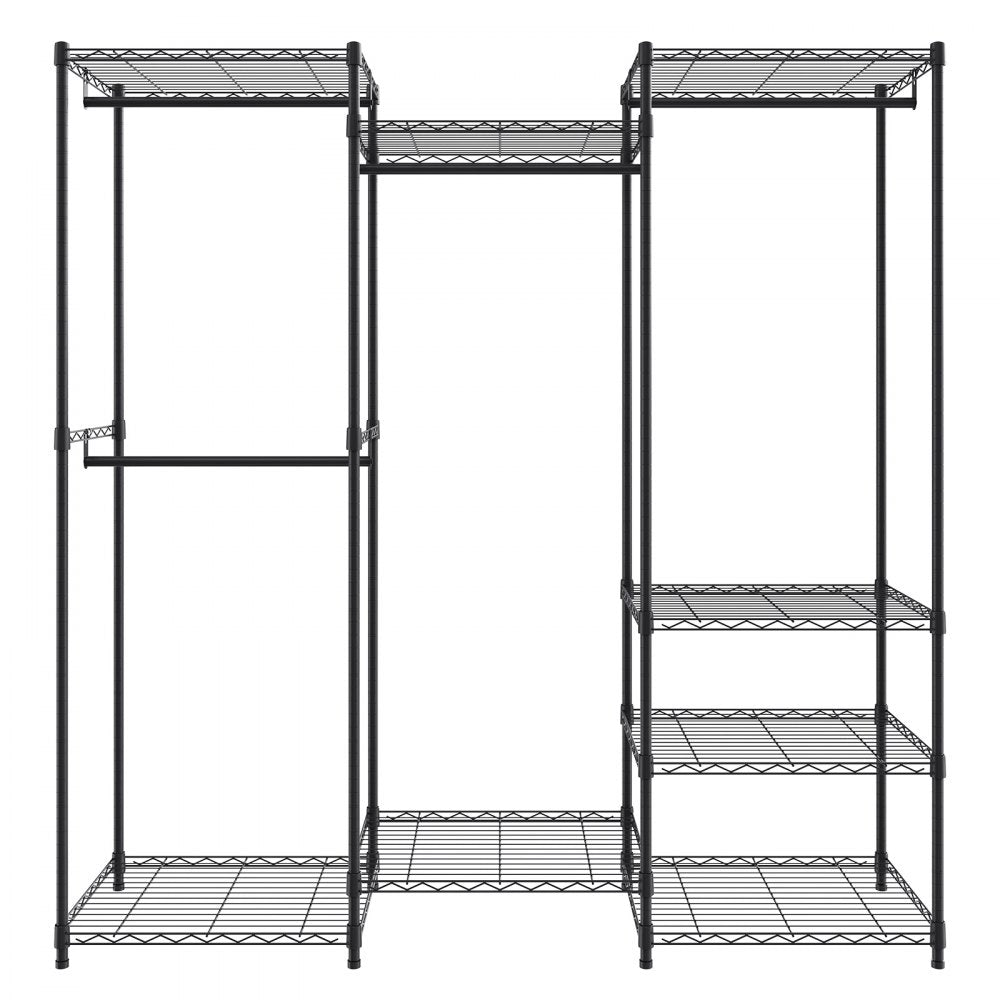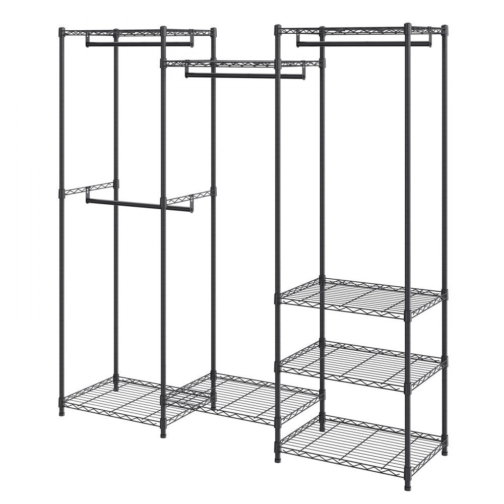 Het biedt meerdere montageopties om aan uw specifieke opslagbehoeften te voldoen. De standaard kan in verschillende combinaties worden geconfigureerd en zelfs worden opgedeeld in twee kledingrekken, zodat hij kan worden aangepast aan verschillende kamerafmetingen.