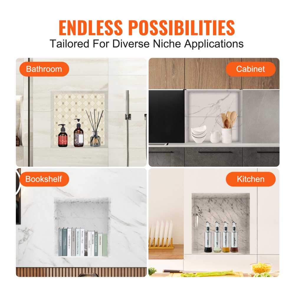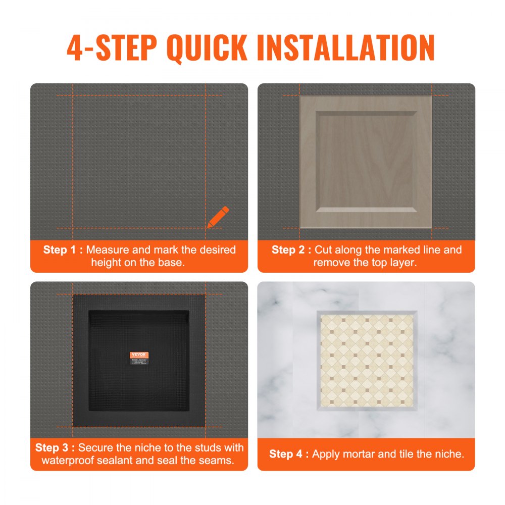 Verstevigingsproces van het oppervlak van de VEVOR-douchenis, resulterend in een beter draagvermogen, geschikt voor elke tegellijm, eenvoudige plaatsing van tegels. Voor horizontale inbouw is er een gratis montagekit verkrijgbaar.
