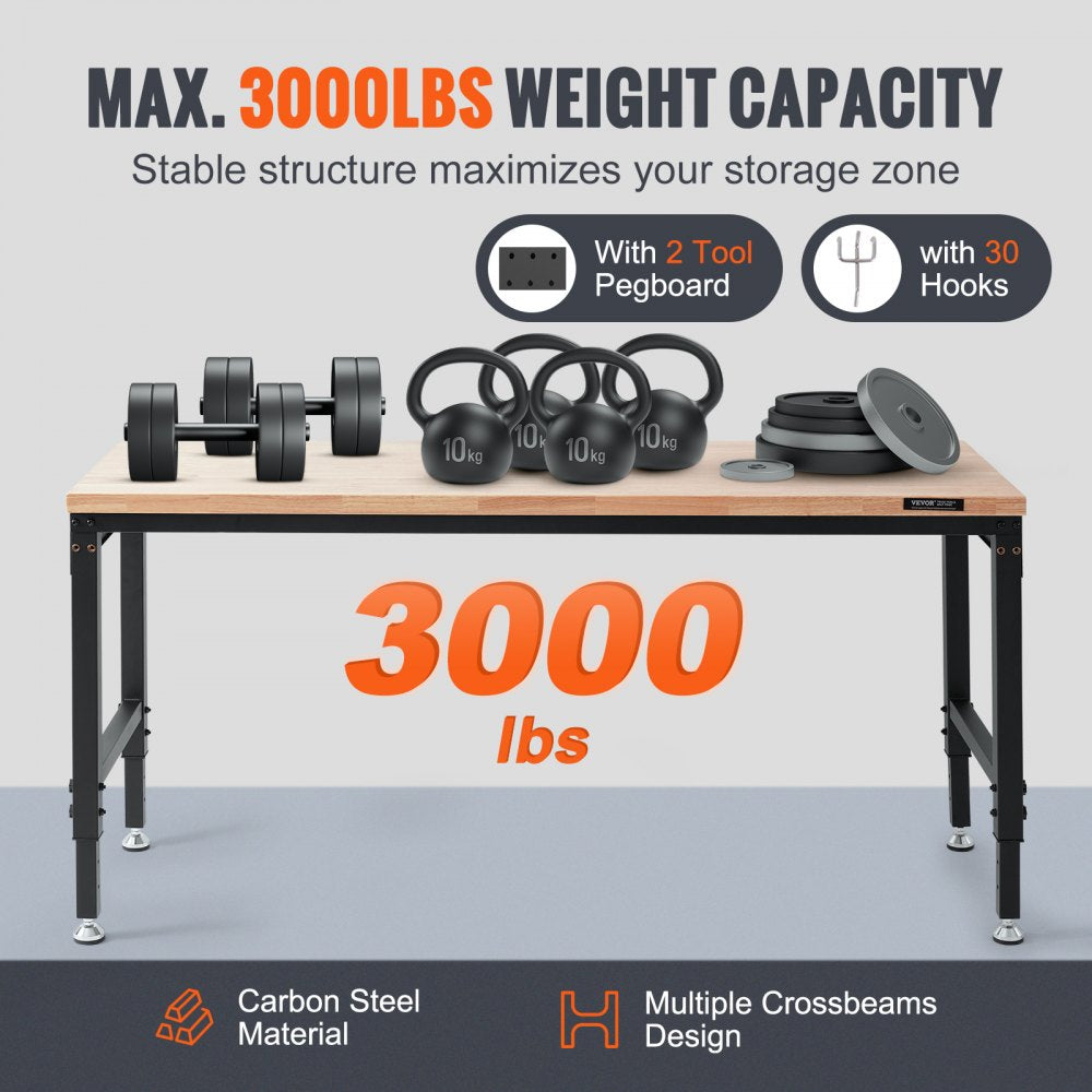 • Stabiele structuur: de garagewerkbank is gemaakt van robuust koolstofstaal met multi-ontworpen dwarsbalken. De werkbank is gemaakt van ca. 3 cm dik rubberhout, dat duurzaam en zwaar is om te dragen.